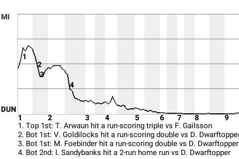 In a tight contest between the Rivendell Royals and the Lake Town Archers, Gildor *Inglorion was the determining factor. The Rivendell left-hander sparkled in his team's 3-1 win. *Inglorion picked up the win for Rivendell, going 6.2 innings. He gave up 1 run on 4 hits. He now sports a record of 15-5. Snugzog Deathskull closed out the game, earning his 29th save.