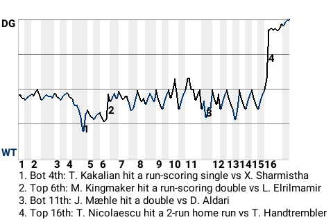 Weathertop used the timely hitting of Xhalh Dridersmasher to seize the win. The pinch hitter stroked a run-scoring single in the top of the tenth inning to put the Witch Kings on top, 4-3. It was his only hit in 1 at-bat, but it was a game-changer.