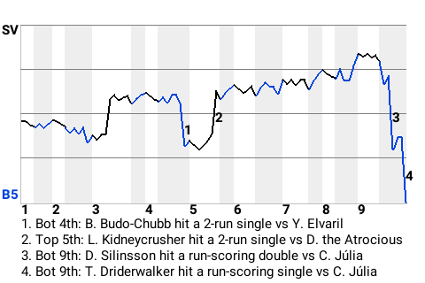 The Serenity Valley Fireflies beat the Gallifrey Time Lords, 4-3. Serenity Valley pitcher and Rhun, Unknown Lands, native Rudolph Ploughman led the way. Mihangyl Dridersmasher, credited with the win in relief, is now 3-4. He allowed no runs on 1 hit in 1 innings.