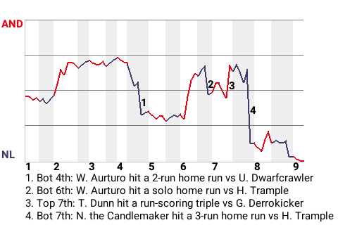 The Diagon Alley Wizards topped the Andelain Giants, 6-4, in Fantasy League action at Ballpark of Diagon Alley. The game was highlighted by the performance of Diagon Alley pitcher Urthag the Slobberer. The Wizards now have a record of 58-66 with the win over Andelain.