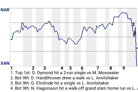 The game was still up for grabs in the bottom of the tenth. With one out, Halflingslobbr hit a fastball from Olalia Goadulphyn for a solo home run. The Kobolds, in dramatic fashion, had a walk-off win.